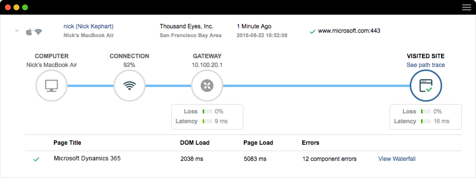 Mit ThousandEyes erhalten Sie transparente Einblicke in Dynamics 365-Netzwerkverbindungen. So können Sie Probleme rasch erkennen und verbringen weniger Zeit mit Ihren Providern. Lassen Sie Dynamics 365 von ThousandEyes Cloud Agents auf der ganzen Welt sowie von Enterprise Agents überwachen, die in Ihren Büros, Rechenzentren und Callcentern ganz einfach installiert werden können. ThousandEyes bietet eine umfassende Ansicht der Dynamics-Performance und sorgt für die Verfügbarkeit und Konnektivität aller Dynamics 365-Funktionen − mit Wasserfallanalysen des Seitenaufbaus, Real User Sessions und Netzwerkkonnektivitätstopologien.