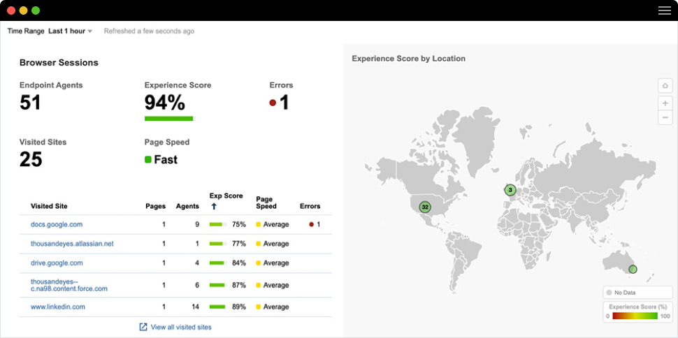 Visualize and score performance across applications, groups of users, and locations to quickly understand how critical services are performing for your workers.