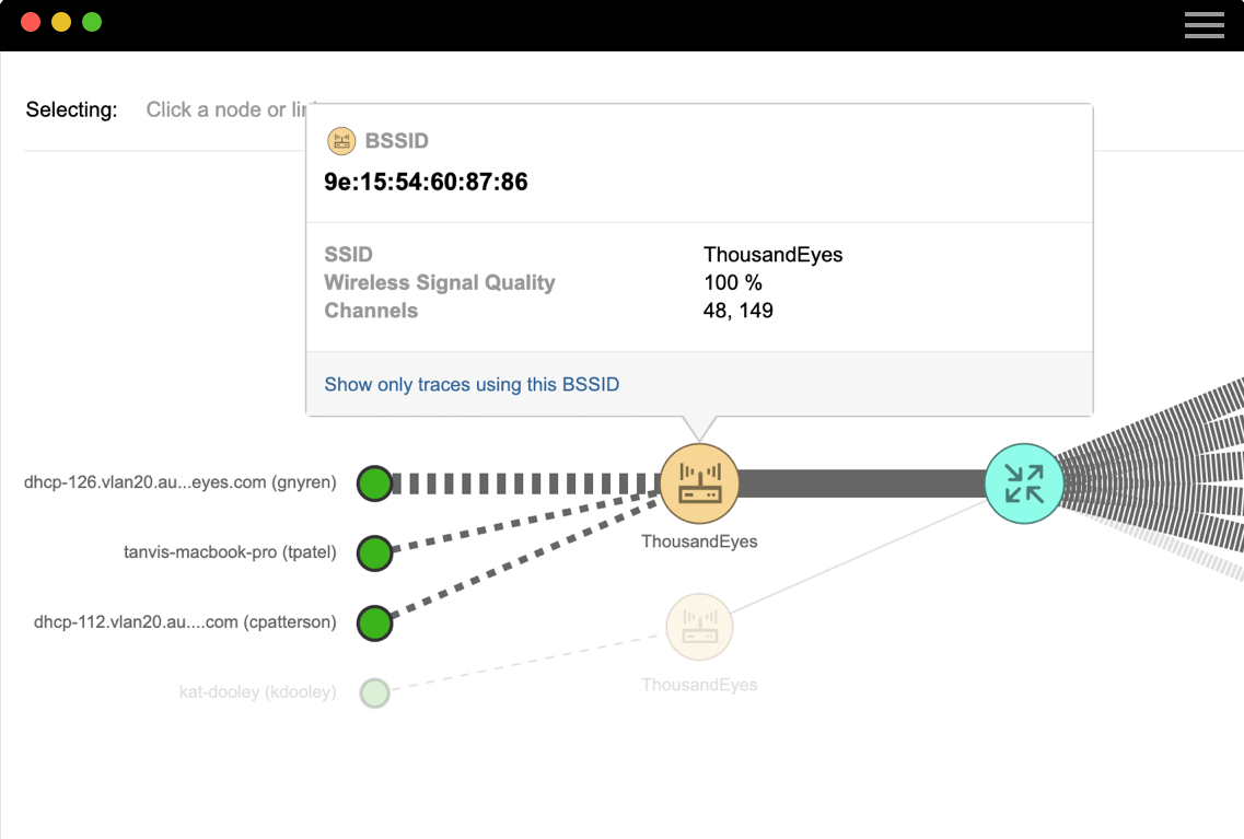 Monitorice en directo el rendimiento de las aplicaciones web con datos reales de los usuarios, desde los clics hasta la carga de páginas, pasando por las cascadas de transacciones y las rutas de red. Con el Endpoint Agent de ThousandEyes, obtendrá una visibilidad completa de los problemas de SaaS, aplicaciones privadas y wifi, independientemente de dónde se encuentren los usuarios.