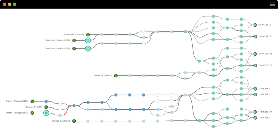 ThousandEyes es el referente en la visualización de ruta de red; ofrece una vista unificada e interactiva de todas las rutas de red entre puntos de visibilidad seleccionados y URL o IP de destino. Esta visualización de ruta avanzada incorpora 16 categorías de datos y métricas, incluidos rDNS, BGP ASN, geolocalización, métricas de extremo a extremo y métricas salto a salto. Cuando se produzcan caídas, puede acceder instantáneamente a las vistas de Internet Insights™ para realizar un análisis más profundo. ThousandEyes gestiona eficazmente diversos escenarios, como redes WAN MPLS, rutas de Internet y topologías de red multicapa, incluidos Cisco SD-WAN y la seguridad basada en la nube, con una visibilidad completa de la conectividad superpuesta y subyacente de WAN o VPN.