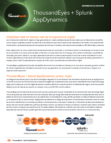 La integración entre ThousandEyes y AppDynamics forma parte de la solución de observabilidad de la pila completa de Splunk, que resuelve el desafío de la visibilidad del servicio de extremo a extremo gracias a que proporciona información exhaustiva sobre todas las dependencias y transacciones de una cadena de prestación de servicios digitales.