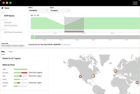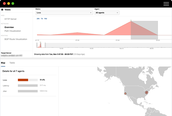ThousandEyes utiliza técnicas de monitorización activa para recopilar métricas de rendimiento fundamentales y visualizar las rutas de distribución desde sus usuarios hasta los centros de datos de AWS. Puede utilizar nuestra monitorización de aplicaciones de AWS para ver la disponibilidad, el uso y los tiempos de respuesta, correlacionados con las latencias y pérdidas de paquetes de red intrarregionales, interregionales e interservicios; así como para identificar problemas de rendimiento en sus entornos de nube o nube híbrida. A diferencia de otras herramientas de monitorización de AWS, ThousandEyes detecta dependencias ocultas en todos los servicios de red de AWS, incluidos S3, EC2, Route53, API Gateway, Cloudfront y Global Accelerator, para minimizar los riesgos operativos. Además, AWS Network Path Enrichment ofrece información detallada sobre los servicios de AWS que se utilizan y la región de AWS que se está recorriendo para ayudarle a entender el enrutamiento geográfico y las ubicaciones desde las que una aplicación presta servicio. Esto permite identificar mejor el alcance de la degradación y solucionar los problemas de la infraestructura en la nube de la que depende su negocio.