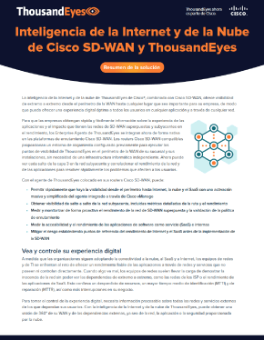 La inteligencia de Internet y de la nube de ThousandEyes ofrece visibilidad de extremo a extremo desde el perímetro de la WAN hasta cualquier lugar que sea importante para su negocio, de modo que pueda ofrecer una experiencia digital óptima para cada usuario en cualquier aplicación y a través de cualquier red. Los Enterprise Agents de ThousandEyes ahora están integrados de forma nativa en las plataformas de enrutamiento Cisco SD-WAN, de forma que puede obtener rápidamente visibilidad salto a salto de la capa superpuesta de la red, con métricas de rendimiento, una ruta detallada, y la capacidad de calcular y monitorizar de forma proactiva el rendimiento de la aplicación SaaS y de la capa subyacente.