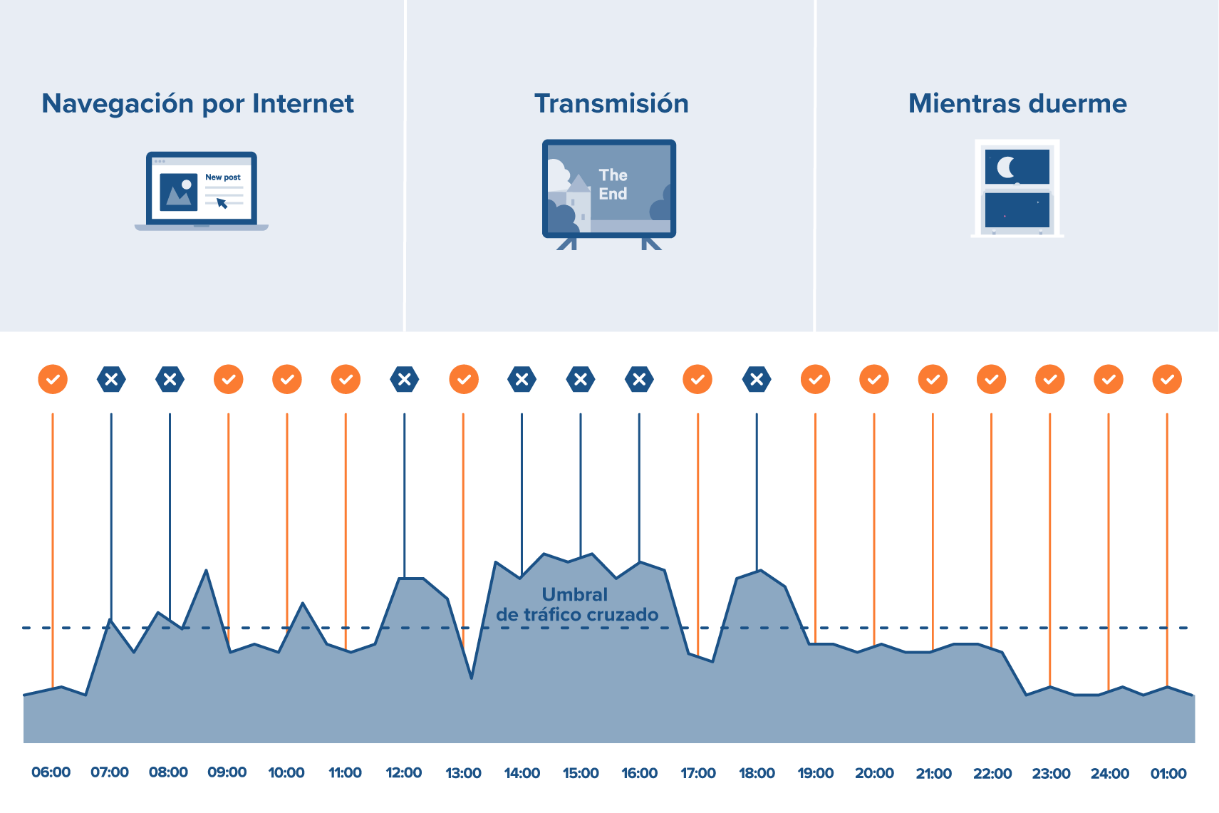 El cronograma de pruebas del Device Agent se puede adaptar según el uso habitual de Internet por parte de los clientes para no interferir demasiado en la experiencia de los usuarios finales; es decir, se realizan pruebas de forma inteligente durante los períodos de poco uso, durante la noche o cuando la red está inactiva.
