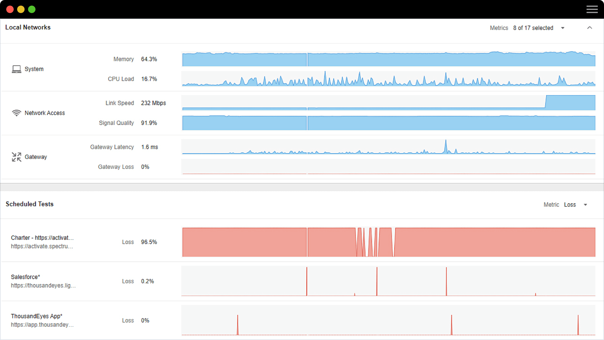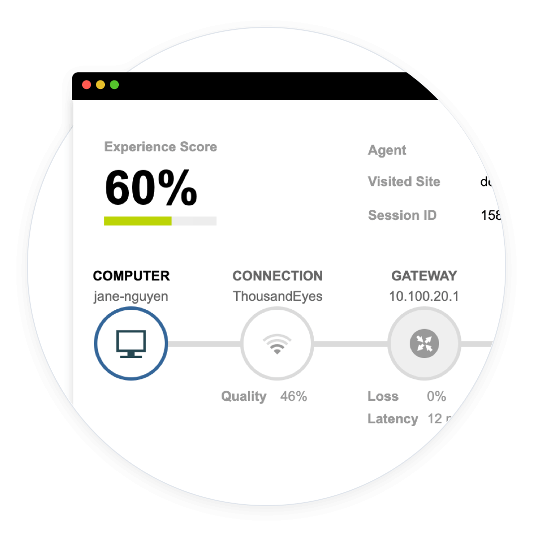 Cisco ThousandEyes Endpoint Experience ofrece a TI visibilidad en tiempo real de cómo las aplicaciones, las redes y los dispositivos afectan la productividad de los empleados en SaaS, la nube, VPN y mucho más. Diagnostique los problemas con rapidez y asegure experiencias digitales fluidas, independientemente de dónde trabajen los usuarios.