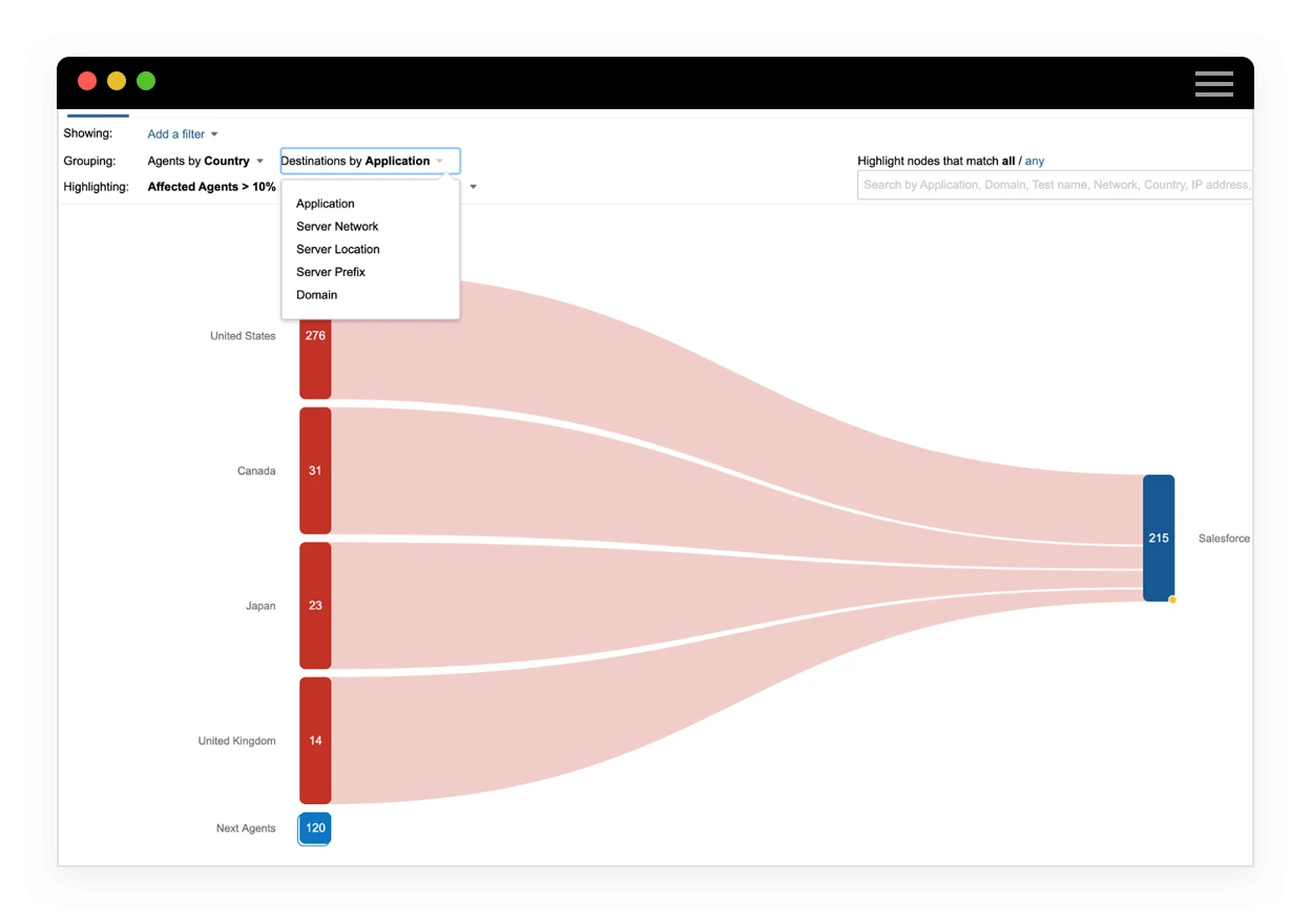 ThousandEyes aprovecha un conjunto de datos de telemetría colectados globalmente para sacar a la luz las interrupciones de las aplicaciones casi en tiempo real. Proporciona información sobre el dominio del problema, ya sea una interrupción de la red, DNS, SSL, un error de la aplicación, etc. Gracias a esta información práctica, el equipo de TI puede eliminar ciclos adicionales de búsqueda y resolución del problema, y comunicarlo internamente, de forma rápida (y con confianza) a las partes interesadas.