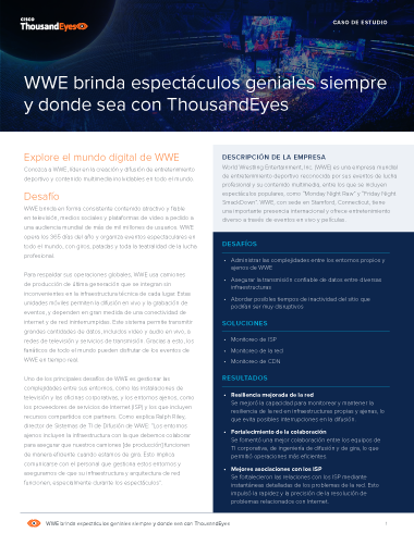 ThousandEyes se convirtió rápidamente en una parte fundamental de las operaciones de TI de WWE: acortó la brecha entre los equipos de TI corporativa, de ingeniería de difusión y de gira. Según Riley, “ThousandEyes ha sido una pieza clave en la mejora del aseguramiento de nuestra cadena de suministro digital al superponerse a nuestra infraestructura de red y asegurar la transmisión confiable de contenido dentro de nuestros sistemas y a nuestros partners mundiales. Las pruebas que configuramos y monitoreamos a través de nuestros tableros son muy eficientes y nos ayudan a identificar rápidamente problemas de latencia, pérdida y fluctuación. Esto nos permite tomar medidas correctivas y asegurar la fiabilidad en toda la transmisión”.