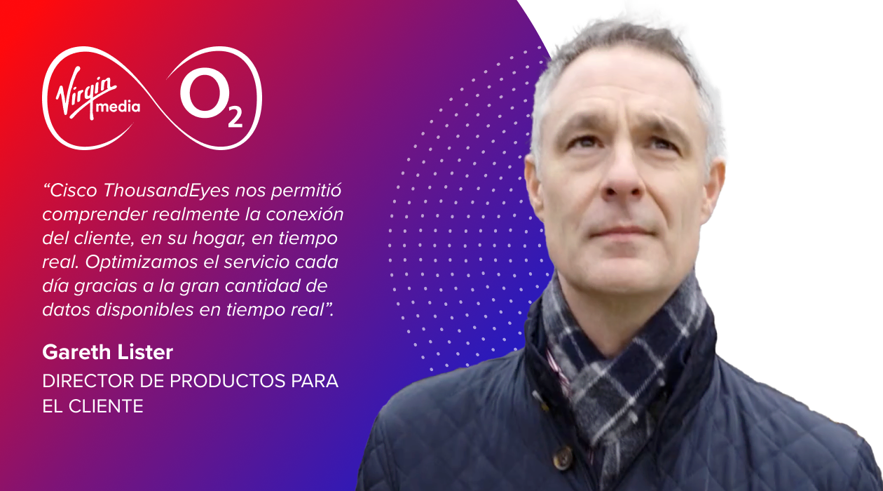 'Cisco ThousandEyes enabled us to really understand the customer's connection, in their home, in real time. We optimize the service every day, and we can do that because we've got masses of real-time data.' Gareth Lister, Director of Customer Products at Virgin Media O2