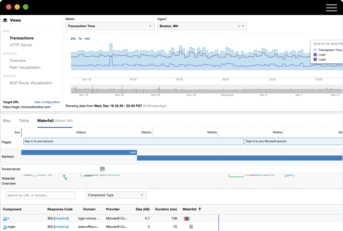 Detecte interrupciones en los servicios en las redes del proveedor de servicios de Internet (ISP), así como en los perímetros seguros y proveedores de DNS, y observe cómo afectan la disponibilidad de la aplicación, los tiempos de respuesta y el rendimiento de carga de páginas.