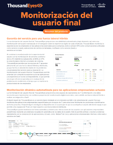 Endpoint Experience de Cisco ThousandEyes ofrece al departamento de TI visibilidad en tiempo real de cómo las aplicaciones, las redes y los dispositivos afectan a la productividad de los empleados en SaaS, la nube, VPN y otros entornos. Diagnostique los problemas con rapidez y garantice experiencias digitales fluidas, independientemente de dónde trabajen los usuarios.