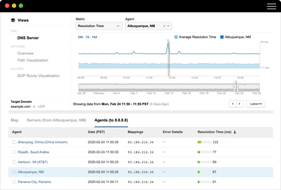 - Exécutez des requêtes récursives et itératives sur les serveurs DNS et recevez des alertes lors de problèmes de rendement et de sécurité