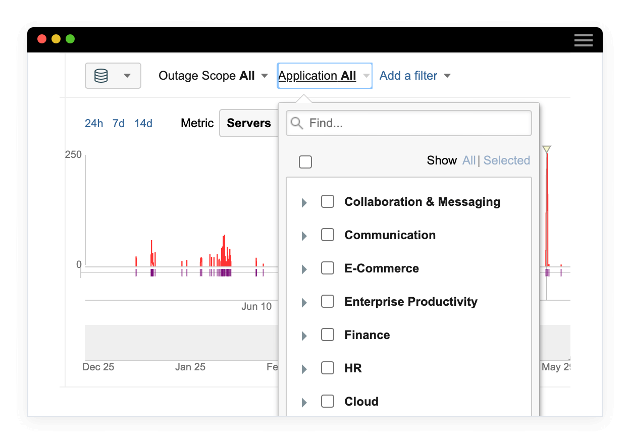 - Affichez des vues en temps réel et des historiques sur la disponibilité des 75 applications en mode logiciel-service les plus utilisées par vos collaborateurs, notamment Salesforce, Slack, Microsoft 365 et bien d’autres encore.