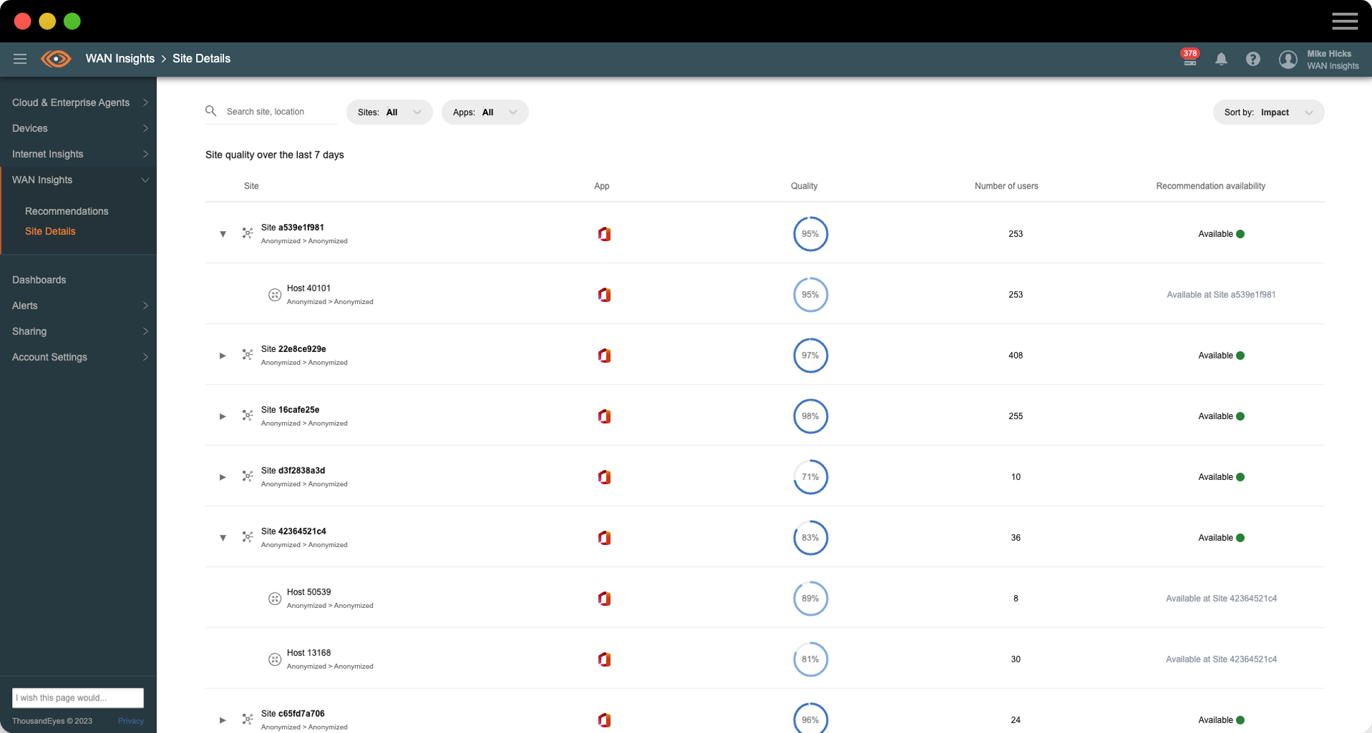 ThousandEyes WAN Insights analyse constamment et en temps réel les données des réseaux superposés et sous-jacents pour fournir des recommandations de stratégies visant à éviter les problèmes d’expérience pour une application sur un site donné. Ces recommandations à long terme sont spécifiques à chaque site et à chaque catégorie d’application, et les estimations de qualité de service correspondent aux améliorations prévues sur le chemin recommandé par rapport au chemin utilisé actuellement.