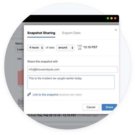 Capturez et partagez une vue des performances en temps réel, sans vous connecter. Les snapshots facilitent la remontée des incidents, la coordination des équipes et la responsabilisation des fournisseurs.