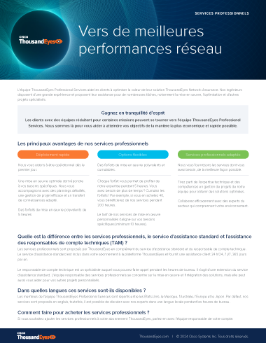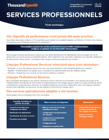 Accélérez et atteignez vos objectifs en matière d'expérience digitale grâce aux services ThousandEyes. Nous proposons une gamme d'offres qui vous aide à tirer le maximum de notre plateforme et à travailler de manière optimale. Nos services incluent une assistance standard 24 h/24 et 7 j/7, des responsables techniques dédiés à votre compte ainsi que des services professionnels.