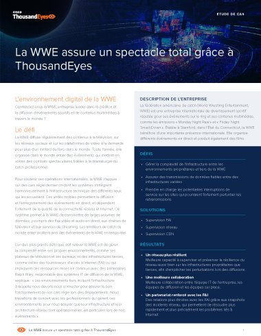 L'exigence de fiabilité s'étend à la chaîne d'approvisionnement digitale de la WWE, de la production de contenu dans les grandes salles de spectacle au traitement des images vidéo dans ses studios de Stamford. Avant d'adopter ThousandEyes, les problèmes de réseau devaient être identifiés et résolus manuellement au moyen de configurations par lignes de commande, un processus chronophage. Ce manque d'efficacité a mis en évidence le besoin urgent d'une solution plus simple répondant aux exigences de la WWE en matière de diffusion.