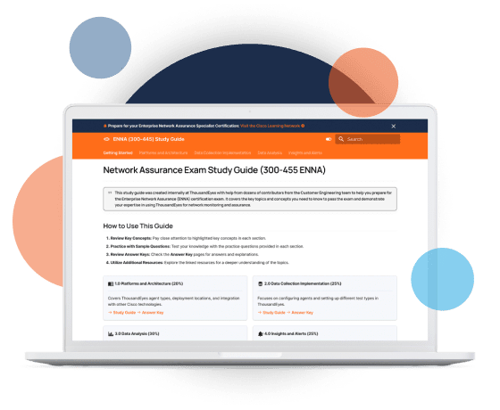 Already a ThousandEyes expert, or want to sharpen your skills? Now you can get ThousandEyes Certified by taking the Enterprise Network Assurance Specialist certification—part of the Cisco Certified Network Professional (CCNP) Enterprise certification.