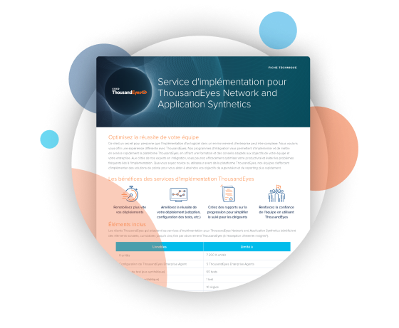 ThousandEyes’ Professional Services team is dedicated to helping you reach your objectives efficiently. Our engineers are experienced networking professionals who help customers in a variety of ways, including implementation, training, and specialized projects. Customers turn to Professional Services to get up and running from the very first day, to get tailored implementations that align with their unique use case and budget requirements, and to leverage the team's deep technical know-how for superior outcomes.