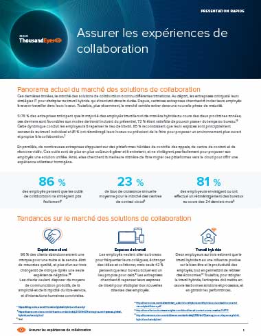 La qualité des expériences client dépend étroitement des moyens dont les employés disposent. Au bureau, il est indispensable de créer un environnement productif qui favorise la communication et le travail en équipe. Alors que les employés retournent au bureau, ils s'attendent à disposer de logiciels de collaboration faciles à utiliser et efficaces. Les systèmes trop lents ou peu fiables − que ce soit pour les réunions vidéo, le partage de fichiers, les tableaux blancs, la prise de note ou les discussions de groupe − peuvent considérablement perturber le travail des équipes et générer de la frustration. C'est pourquoi les entreprises doivent s'assurer que leurs outils de collaboration fonctionnent de manière fluide pour favoriser la productivité et la satisfaction de leurs employés.