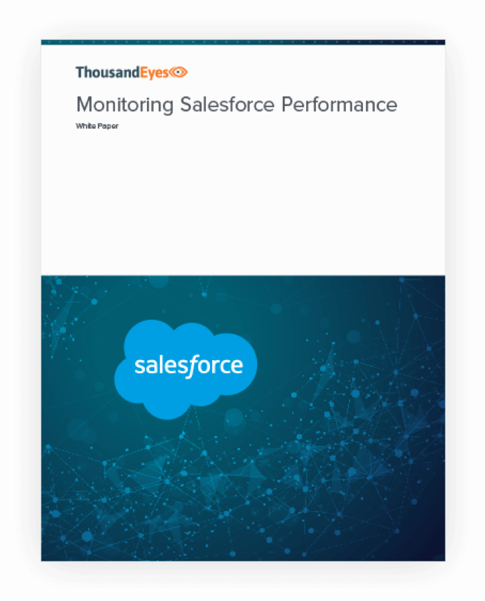 Grâce aux techniques de supervision active ThousandEyes et la mise en corrélation des données de la couche applicative avec les données de la couche réseau, ThousandEyes fournit aux entreprises la supervision Salesforce dont elles ont besoin pour un déploiement initial ou existant de la plateforme, et pour établir les références et indicateurs de performance nécessaires afin de fournir la meilleure expérience utilisateur possible grâce à des contrôles complets de l'intégrité du système.