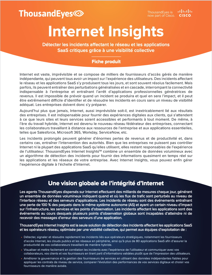 ThousandEyes Internet Insights : Network Outages offre aux équipes IT une visibilité renforcée sur les services Internet et les environnements cloud, à chaque saut du réseau et chemin de routage. À l'aide de points d'observation pré-déployés à l'échelle mondiale, Internet Insights™ détecte les pannes réseau chez les fournisseurs d'accès à Internet (FAI) ainsi qu'au niveau des clouds publics (tels qu'Amazon Web Services, Google Cloud Platform et Microsoft Azure) et des services en périphérie du réseau (comme les services CDN, DNS et SECaaS). Vous bénéficiez ainsi d'une visibilité inégalée sur vos fournisseurs.