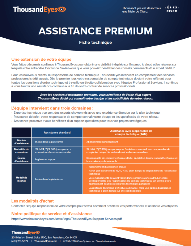 Accélérez et atteignez vos objectifs en matière d'expérience digitale grâce aux services ThousandEyes. Nous proposons une gamme d'offres qui vous aide à tirer le maximum de notre plateforme et à travailler de manière optimale. Nos services incluent une assistance standard 24 h/24 et 7 j/7, des responsables techniques dédiés à votre compte ainsi que des services professionnels.