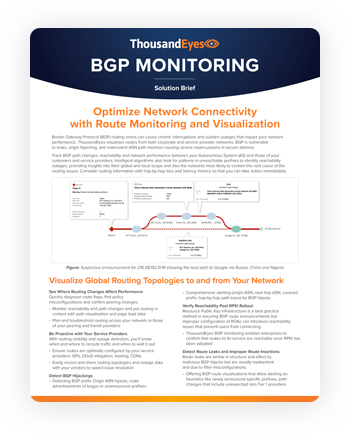 La supervision BGP de ThousandEyes offre une visibilité en temps réel sur les perturbations du routage Internet afin de détecter plus rapidement les failles, d'optimiser les performances et de protéger les expériences digitales à travers votre entreprise.