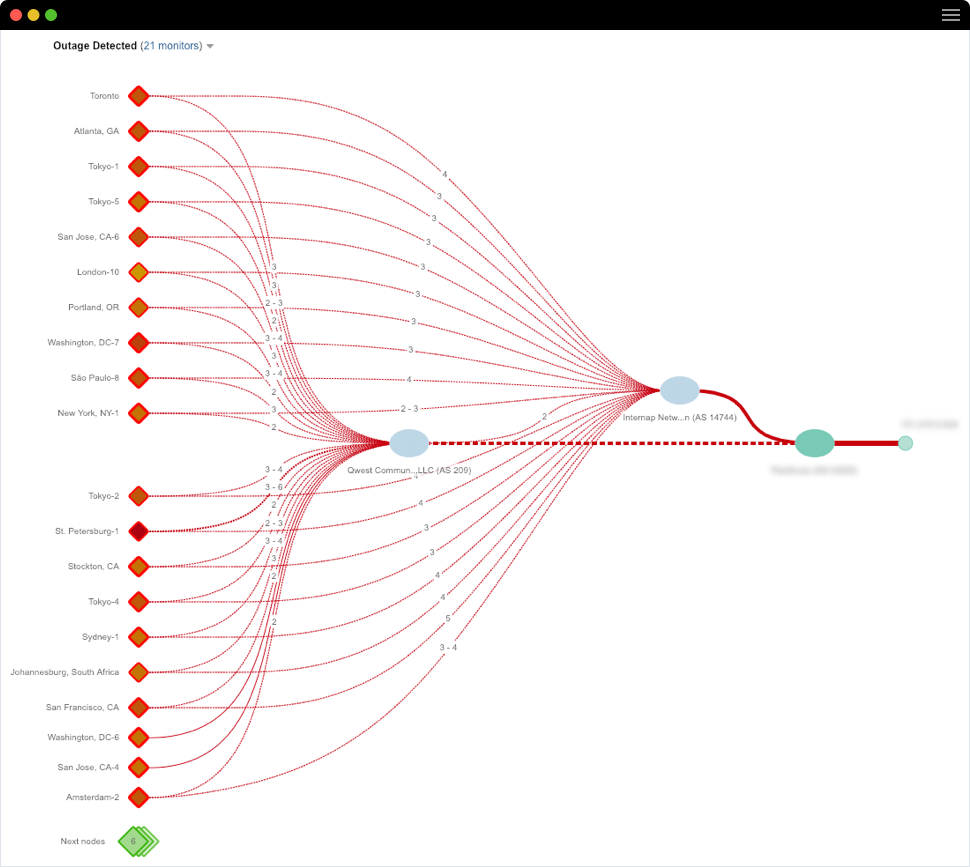 Mettez en place un système d'alertes efficace pour recevoir des notifications proactives en cas de modification de l'accessibilité des préfixes ou des chemins AS. Contextualisez le routage à l'aide de données visuelles sur les réponses HTTP, le chargement des pages et le chemin spécifique des applications.