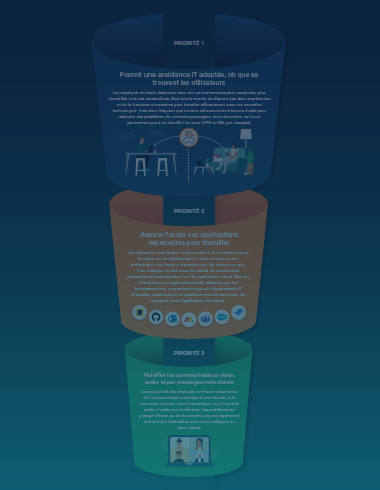Qu'ils se connectent dans le périmètre de l'entreprise ou à distance, les collaborateurs ont besoin de performances fiables et fluides pour travailler efficacement. Dans un modèle de travail hybride, où une grande partie des collaborateurs travaillent aussi bien à la maison qu'au bureau, le manque d'homogénéité entre les environnements locaux, dont la plupart ne sont pas contrôlés par l'équipe IT, a un impact significatif sur les performances. Pour offrir une expérience digitale optimale à leurs collaborateurs, le département IT et le service d'assistance ont besoin d'une visibilité complète et unifiée sur les utilisateurs et leurs applications SaaS et on-premise, y compris les performances du Wi-Fi et du LAN, le débit du FAI et les données sur les pannes Internet.