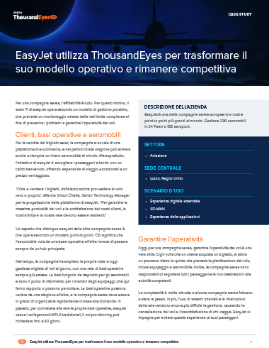 Gli aspetti coinvolti nelle attività di trasporto aereo sono tantissimi, quindi è essenziale avere una visibilità completa della rete. Con ThousandEyes, easyJet può garantire il miglior servizio al cliente e volare sempre più in alto.