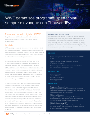 L'esigenza costante di offrire trasmissioni perfette al pubblico mondiale ha spinto WWE a rivolgersi a ThousandEyes per una solida soluzione di Assurance. La strategia comportava l'implementazione di Enterprise Agent presso la sede centrale e a bordo delle unità mobili di produzione televisiva per ottenere sia resilienza, che ampia visibilità. Le visualizzazioni e le dashboard personalizzate consentono a WWE di controllare l'infrastruttura di sua proprietà e quella di terzi, come ISP e CDN (Content Delivery Network), e individuare potenziali problemi prima che possano interrompere le trasmissioni seguite dagli appassionati di wrestling.