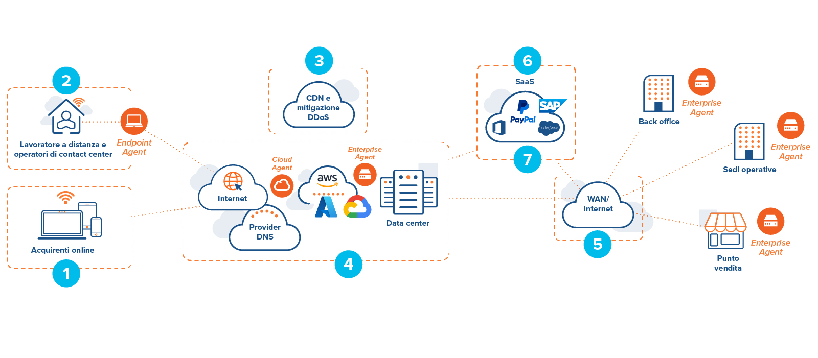 Monitora dall'interno la LAN, la WAN e lo stato di Internet per rilevare rapidamente le interruzioni e le anomalie del traffico dovute ai dirottamenti BGP o agli attacchi DDoS che possono compromettere le attività di vendita o di evasione degli ordini.