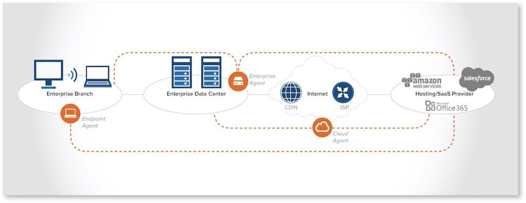 Endpoint エージェントの展開により、エンドユーザーの状況をほぼリアルタイムで識別および診断することができます。Enterpriseエージェントとは異なり、EndpointエージェントはWindowsおよびmacOSオペレーティングシステム上でネイティブに実行されます。 次の図は、Endpoint、Enterprise、および Cloud エージェントの展開場所の典型的な例を示しています。