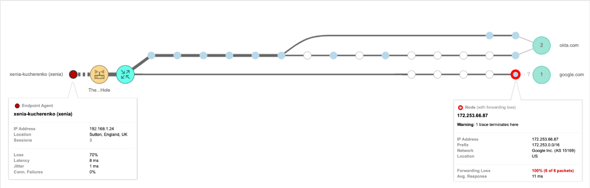 リモート業務を継続する従業員の生産性を維持するためには、ITチームはリモートワーカーが体感するサービス品質をよりよく把握する必要があります。まず、ユーザーが利用するSaaSと自社アプリのサービス品質を監視し、これらをWiFi、ISP、VPNゲートウェイなどの基盤となるネットワーク接続に関連付けることにより、パフォーマンス問題を切り分けて解析することが可能になります。