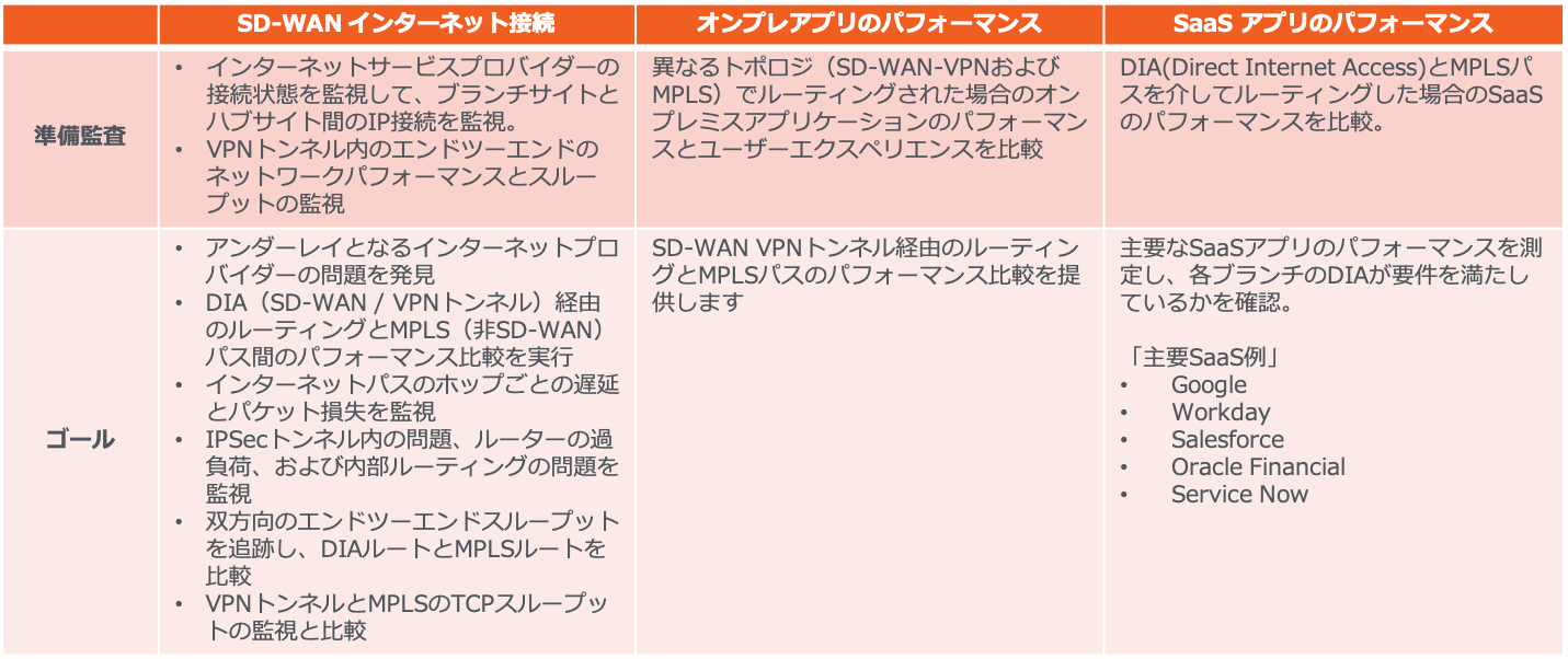 では、どのようなパフォーマンスデータを収集する必要があるのでしょうか?まず最初に、優先度の高い社内アプリケーション、AWS、Azure、GCPなどで実行される重要なアプリ、Office 365などのSaaSアプリなどのユーザーエクスペリエンスを測定することから始めます。 SalesforceおよびWorkday。VoIPとWebexやZoomなどのコラボレーションツールも忘れないでください。これらのアプリとサービスが現在のネットワークを介してどの程度機能しているかをベースラインとして測定することから始めます。アプリケーションサイトのページ読み込み時間、HTTPテスト、エンドツーエンドのネットワークパフォーマンス、およびBGPルーティングの可視化により測定と監視を開始します。ミッションクリティカルなユースケースの場合は、Webシナリオを用いたトランザクション監視テストを実行します。 既存ネットワーク上でのトランザクションパフォーマンス、応答時間、可用性、ネットワーク遅延、パケット損失、ジッターのデータ取得により、次のステップに進む準備が整います。