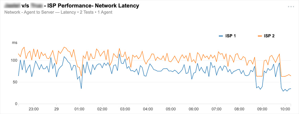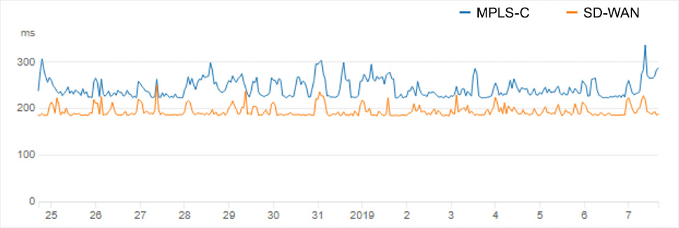 ある程度のデータが収集された段階で、主要なアプリとサービスのデータをダッシュボード上で並べて表示し、SD-WANとMPLS経由のパフォーマンスを比較します。 図2にあるお客様の場合、SD-WANによるインターネット経由での接続がMPLSと同等もしくはそれ以上に機能し、遠隔地からでも重要なアプリケーションに高いパフォーマンスを提供できることがわかりました。