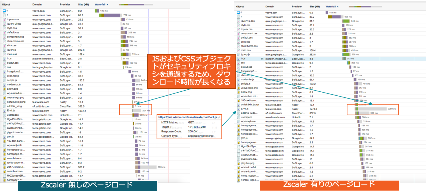 重要なSaaSアプリケーションへのアクセスを、クラウドベースのセキュリティプロバイダーPoPを通過する監視と、PoPをバイパスする監視の2通りで設定します。これにより、クラウドベースのプロキシがパフォーマンスにどのように影響するかを確認でき、アーキテクチャ設計とセキュリティ方針の判断を下すことができます。 図4は、Zscalerを通過するVeevaクラウドサービスへのアクセスと、ブランチからZscalerを介さずVeevaサービスに直接アクセスするページロード時間の比較を示しています。