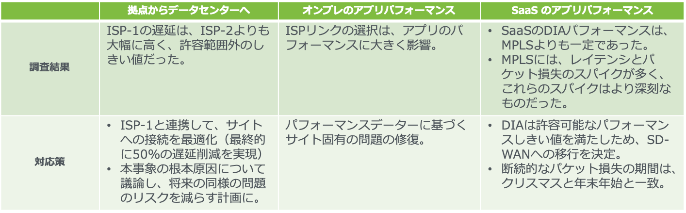 これにより、運営委員会またはその他の関係者向けの準備監査レポートの作成が可能になり、SD-WANがビジネスにどれくらい効果をもたらすかも指し示し、デジタル変革の取り組みをサポートします。 また、SD-WANを介したリモートサイトのベースラインやパフォーマンスの比較により、計画中の新しいWANエッジインフラ投資の実行可能性と見込みを証明することができます。 図5は主な調査結果とその後の対応策の一例となります。