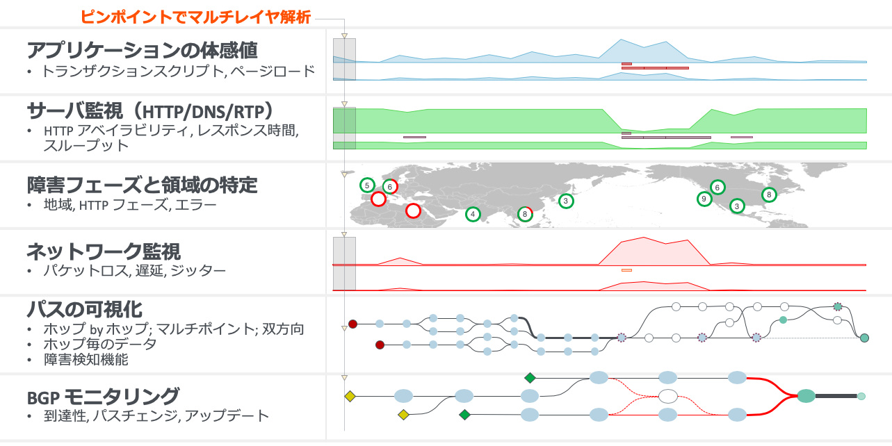 ThousandEyesの利用により、アプリとオーバーレイネットワークのパフォーマンスを取得してMPLS回線の場合と比較できるだけでなく、アンダーレイとなるインターネットトランスポートのエンド・ツー・エンドおよびホップ・バイ・ホップのパフォーマンス、およびBGPルーティングパスの変更や安定性の問題も発見できます。
