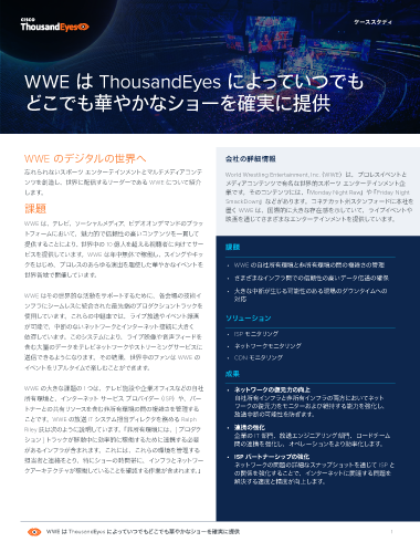 ThousandEyes により、WWE はネットワークの異常を早期に検出して、平均修復時間(MTTR)を大幅に短縮し、障害が組織に与える影響を軽減することができます。ThousandEyes プラットフォームは、MTTR を改善しただけでなく、可視性とコラボレーションを向上させ、WWE のネットワーク インフラストラクチャを強化し、世界中の視聴者に高品質なコンテンツ配信を行うのに役立っています。