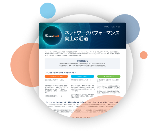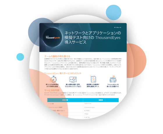 ThousandEyes’ Professional Services team is dedicated to helping you reach your objectives efficiently. Our engineers are experienced networking professionals who help customers in a variety of ways, including implementation, training, and specialized projects. Customers turn to Professional Services to get up and running from the very first day, to get tailored implementations that align with their unique use case and budget requirements, and to leverage the team's deep technical know-how for superior outcomes.