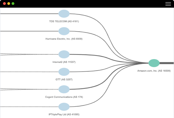 - ほぼリアルタイムの BGP モニタリングとアラート:ルートハイジャック、情報漏洩、および脅威をほぼリアルタイムで検出・軽減。脆弱性に先んじて対処できるようになります。