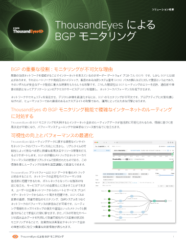 - BGP を活用した統合ネットワーク分析:BGP を他のテレメトリデータと組み合わせることで、ネットワークの正常性を包括的に把握できます。
