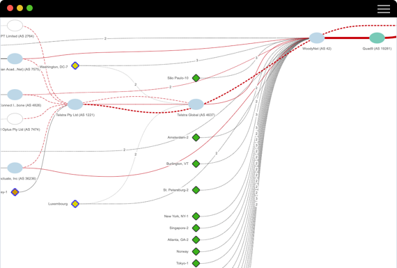 BGP モニタリングにより、世界中のリアルタイムデータから、ネットワークのプレフィックスを強力に可視化。これにより、インターネット規模の情報をリアルタイムで確認できます。