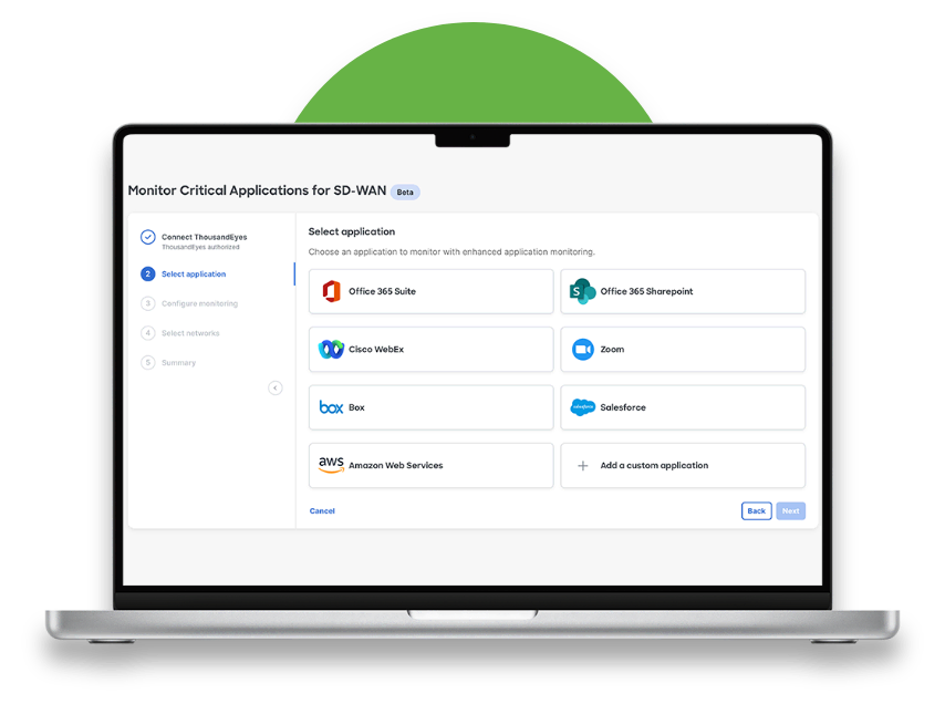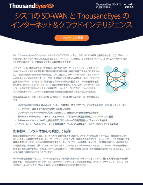 ThousandEyes のインターネット&クラウドインテリジェンスは、WAN エッジからお客様のビジネスにとって重要なあらゆる場所までをエンドツーエンドで可視化するため、あらゆるネットワークを介してあらゆるアプリケーションを使用するあらゆるユーザーに最適なデジタル体験を提供できます。ThousandEyes Enterprise Agent は、Cisco SD-WAN ルーティング プラットフォーム内にネイティブに統合されるようになったため、アンダーレイネットワークをホップごとに迅速に可視化して詳細なパスや評価指標などを取得し、オーバーレイと SaaS アプリのパフォーマンスを評価してプロアクティブに監視できます。