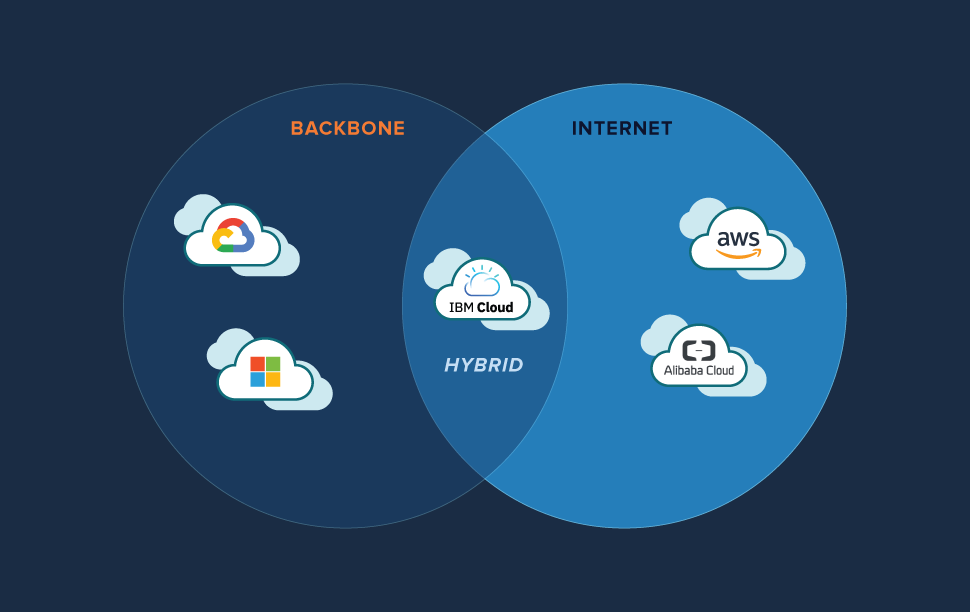 今年の調査に追加されたAlibaba CloudとIBM Cloudは、他のクラウドプロバイダーと同等のパフォーマンスを提供していることがわかりました。 Alibaba Cloudは、ユーザートラフィックの大部分を独自のプライベートネットワークバックボーンではなくインターネットに大きく依存している一方、IBMは、ユーザートラフィックがアクセスしている地域に応じて、独自のプライベートバックボーンとパブリックインターネットの両方を使用してトラフィックを配信するハイブリッドアプローチを採用しています。