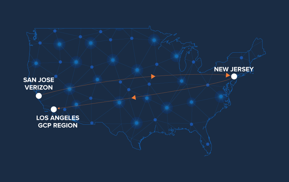 調査結果5:米国のブロードバンドISPの選択により、クラウドのパフォーマンスに違いが生じます。ブロードバンドのパフォーマンスはプロバイダー間で比較的一貫していますが、成熟した米国市場でもパフォーマンスに差が見られました。観察した例の1つは、「シアトル、サンノゼ、ロサンゼルスのVerizon接続サイト」からロサンゼルスに位置する「GCP us-west2リージョン」へのトラフィックに関係しています。このシナリオでは、トラフィックが、ロサンゼルスにあるリージョンに戻る前に、ニュージャージーのGoogleバックボーンに入るようにルーティングされていました。この最適化されていないルーティングの結果、予想されるネットワーク遅延が最大10倍になります。ハイブリッドWANの展開を検討している企業は、インターネットの可視性を確保して、このような異常を検出し、ISPまたはクラウドプロバイダーと協力して問題を解決できるようにする必要があります。