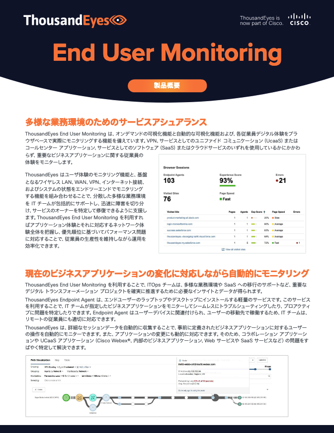Cisco ThousandEyes Endpoint Experience は、各種のアプリケーション、ネットワーク、デバイスが従業員の生産性に与える影響を、SaaS、クラウド、VPN などの全体でリアルタイムに可視化します。 問題を迅速に診断し、ユーザーの勤務場所を問わずシームレスなデジタル体験を保証します。