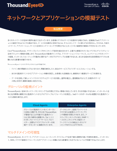 ThousandEyes Network & Application Synthetics で提供されるでは、デジタルエコシステム全体をエンドツーエンドで可視化することで、WAN に加え、今日の常時接続の世界で重視されるあらゆるアプリケーションとユーザーを把握できます。このテスト支援は、実際のユーザーのモニタリングだけでなく、継続的でリアルタイムな接続性、遅延、ページロードといった指標の取得も可能にするため、サービスレベル契約(SLA)の遵守にもつながります。