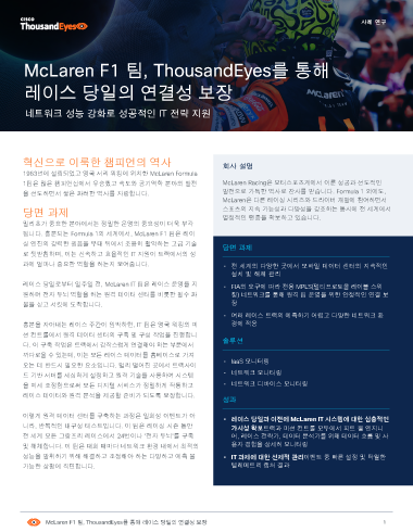 이제 McLaren Racing IT 팀은 ThousandEyes를 통해 시스템에 대 한 전례 없는 가시성을 확보하여 데이터의 흐름을 꼼꼼하게 모니 터링하고 전송되는 정보의 양을 추적하며 사용자 경험을 간편하게 평가할 수 있게 되었습니다. 특히 막대한 압박을 받으며 운영하는 환경을 고려하면, 이렇게 세밀한 인사이트는 IT 팀에 반드시 필요 합니다.